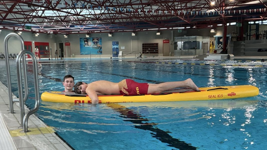 Beim heutigen Training stand der sichere Umgang mit dem Rettungsbrett im Mittelpunkt. Ein Rettungsgerät dient dazu, Rettungsschwimmerinnen und Rettungsschwimmer im Einsatz zu unterstützen und Abläufe effizienter und sicherer zu machen. Das Rettungsbrett fungiert dabei als stabiler Auftriebskörper, der ein schnelles Erreichen der verunfallten Person und deren sicheren Transport ermöglicht.